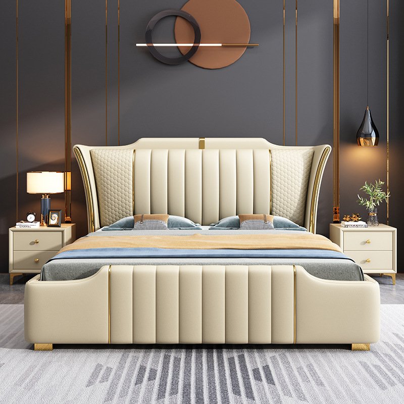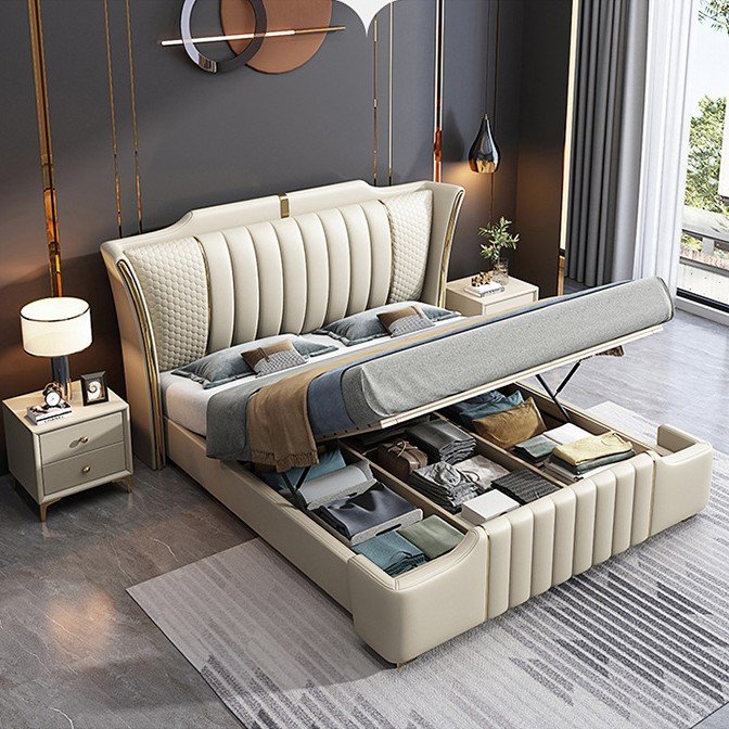 Symmetric Upholstered Leather King Bedframe Gas Lifting