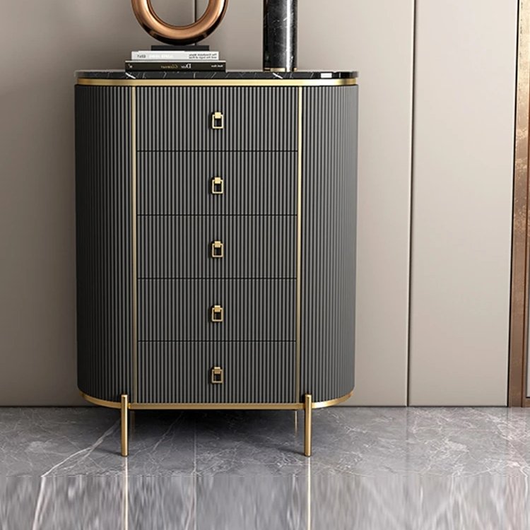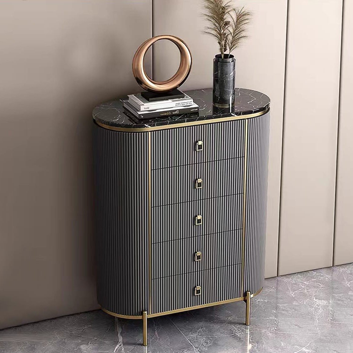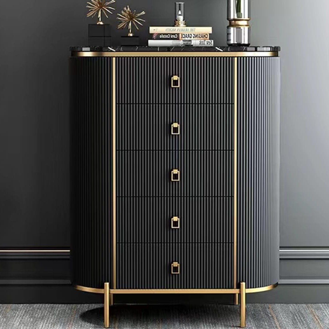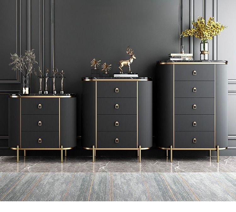 The Mozart Tallboy combines elegance and functionality, featuring a durable marble sintered stone top and five deep drawers for ample storage. Crafted from solid wood and metal, it is available in Beige, Black, Grey, and Emerald, with custom colours available. Measuring L80 × W40 × H115 cm, this piece adds a touch of style while keeping your living space organized.