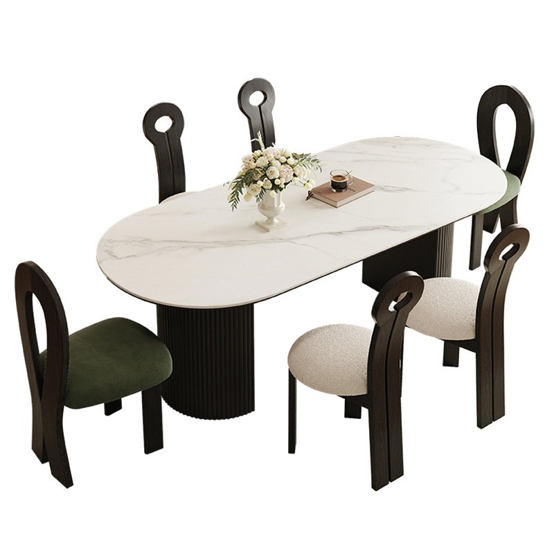This elegant rock slab table with antibacterial properties, and effortless maintenance. Crafted with a 12MM matte slate surface layered over 18MM multi-layered solid wood, it blends the natural beauty of timber with the high-performance resilience of stone. Withstanding up to 1200° of heat, the rock plate is resistant to abrasion, staining, and penetration—making it ideal for daily use. Its flat, wide desktop offers generous space for dining, working, practicing calligraphy, or playing board games. Supported by concave C-shaped wide legs, the table provides solid stability and showcases the graceful wood grain for a refined aesthetic. Whether used as a dining table or creative workstation, this piece brings timeless style and versatility to any living space.