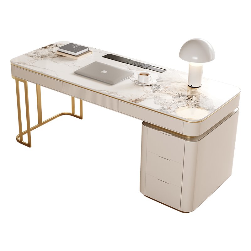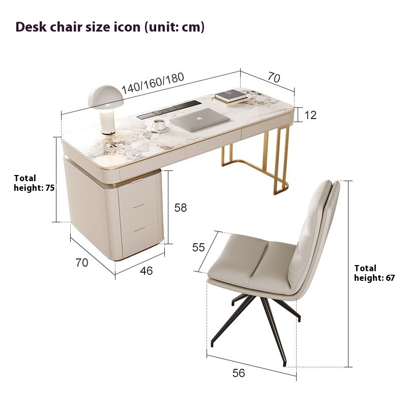 This versatile desk blends elegance and practicality with its golden stainless steel frame, high-gloss sintered stone countertop, and piano lacquer finishes. Designed for both work and leisure, it features a humanized lift lid, built-in USB port, and dual sockets with hidden cable routing for a clean, modern setup. The E1-grade eco-friendly board and 4C piano baking varnish ensure a scratch-resistant, moisture-proof, and low-odor surface. With a spacious dual-drawer system, silent slide hardware, and solid pine open shelving, this desk is built for durability, style, and seamless function—perfect for office productivity .