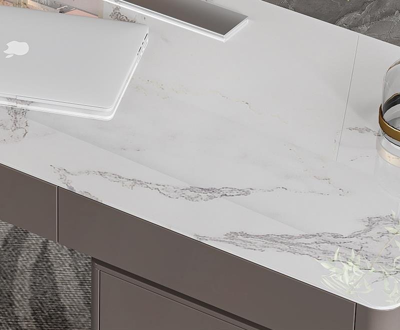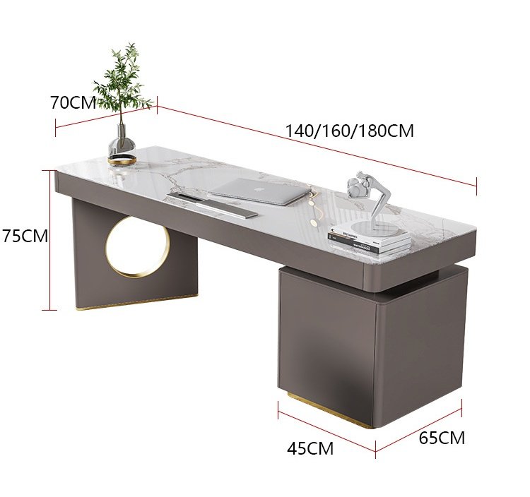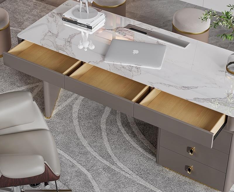 This modern Solid Marble Office Desk pairs refined aesthetics with everyday practicality. Featuring a 6mm Italy-imported rock slab tabletop, it offers a smooth, high-gloss surface that’s scratch-resistant and built to last. The 304 stainless steel gold-plated corners and elegant curved edges provide both impact resistance and a luxe, contemporary look. Designed for convenience, it includes a USB port and three-hole socket with a 210cm power cord, compatible with both floor and wall outlets—ideal for fast charging your devices during meals or meetings. Three solid pine wood drawers add natural warmth and practical storage to the base, while the table’s sturdy build ensures long-term durability.