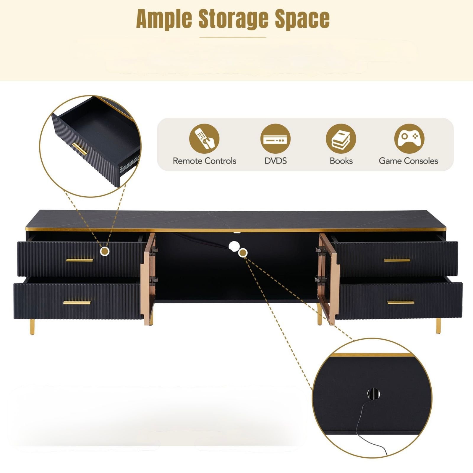 Designed to fit 65-inch TVs and larger, the stand includes wide shelving made from durable wood, offering ample storage for media devices, décor, and daily essentials.
