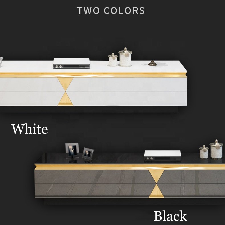 Main Materials: Tempered Glass Top + High Gloss Paint Body + Wood frame + Gold Accents