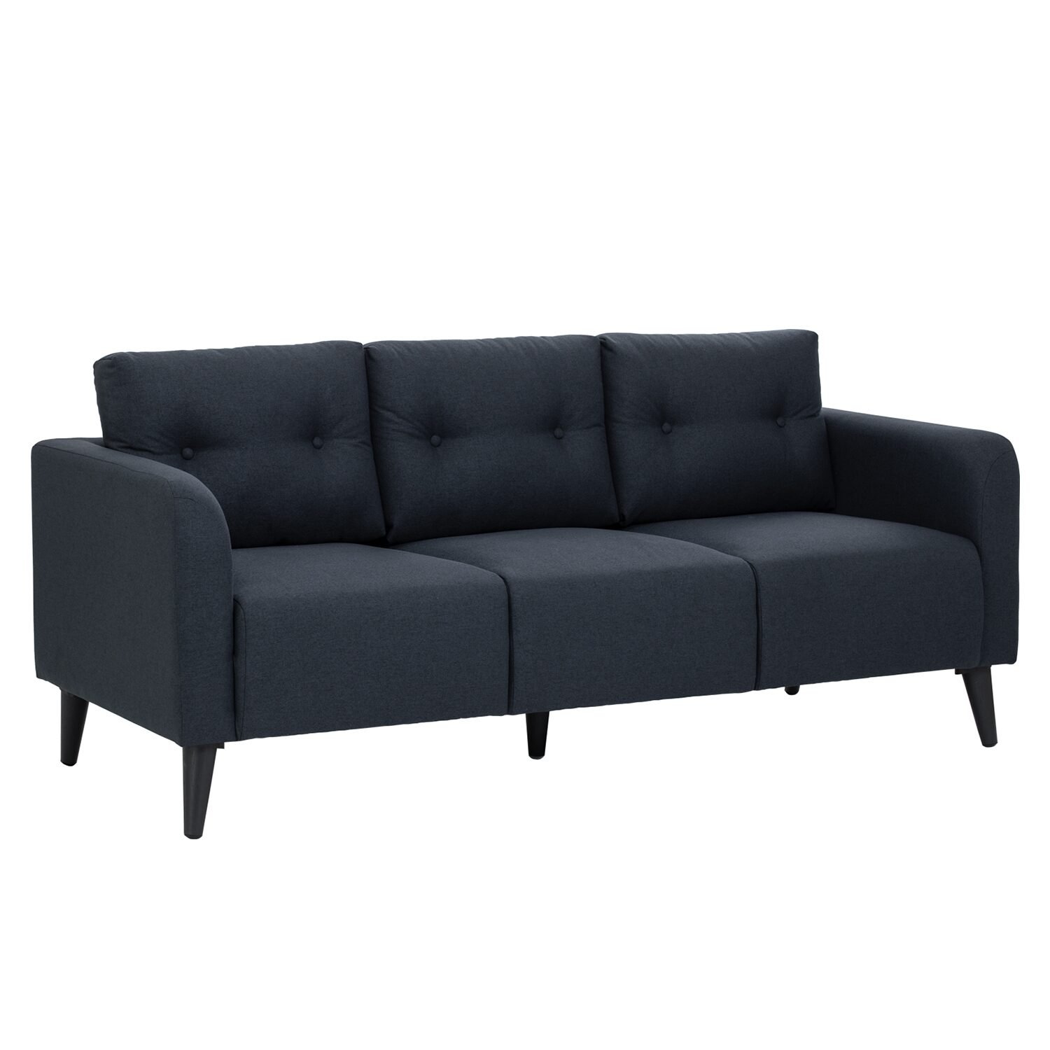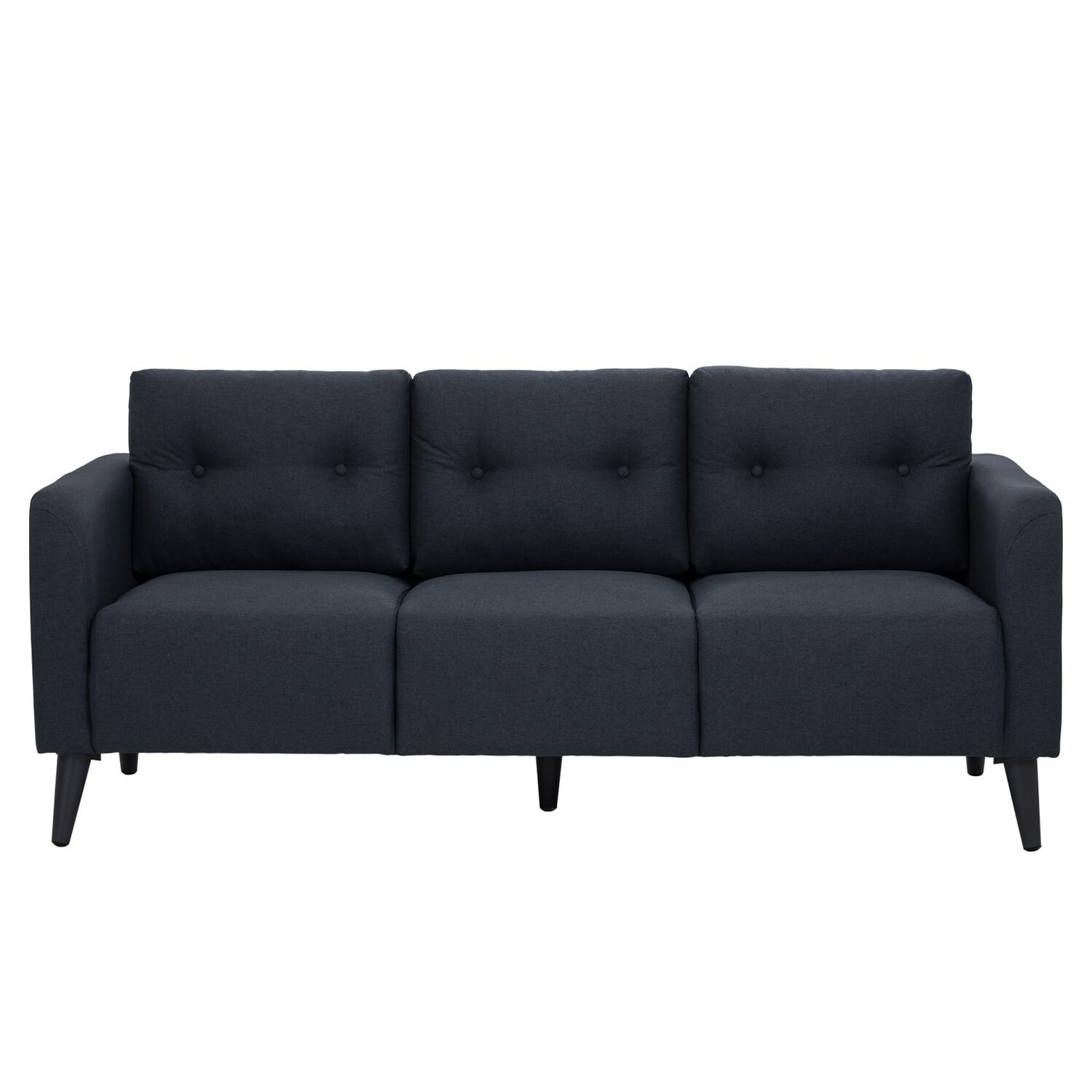 Alto 3 seater sofa in Black colour leg, Navy colour Challis fabric body. The Alto 3 Seater Sofa merges Mid-Century Modern simplicity with Contemporary ease. Built with a tropical wood frame, it ensures durability. Upholstered in challis fabric in navy, it adds depth and elegance. Black PVC legs give it a sleek, modern base. With its compact yet inviting design, Alto fits well in apartments or family homes. The sofa’s structured form provides balanced comfort. Its bold navy tone adds character while keeping versatility. Alto is a stylish and practical choice for everyday living.