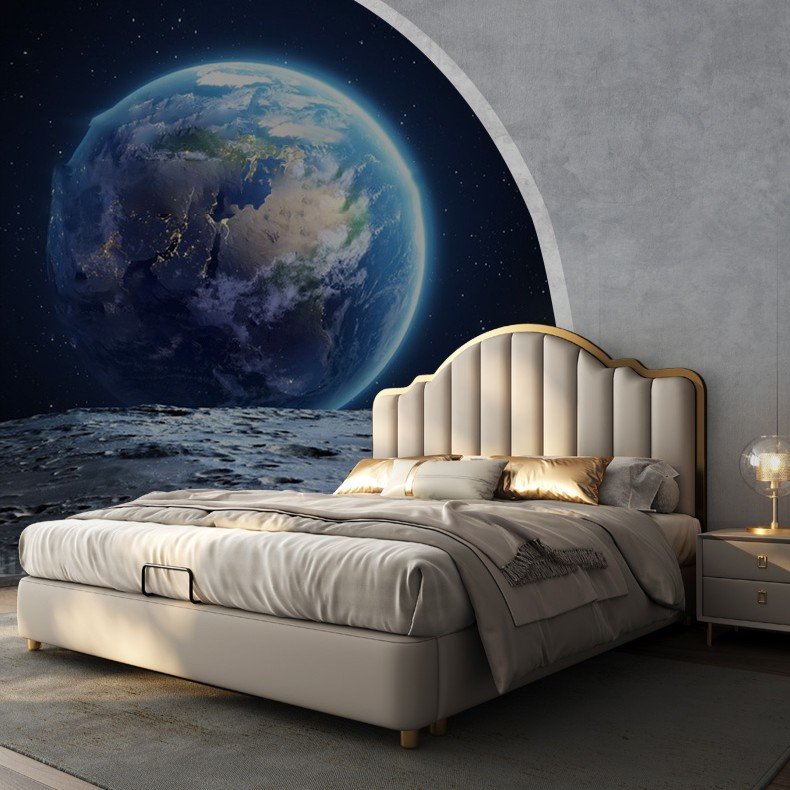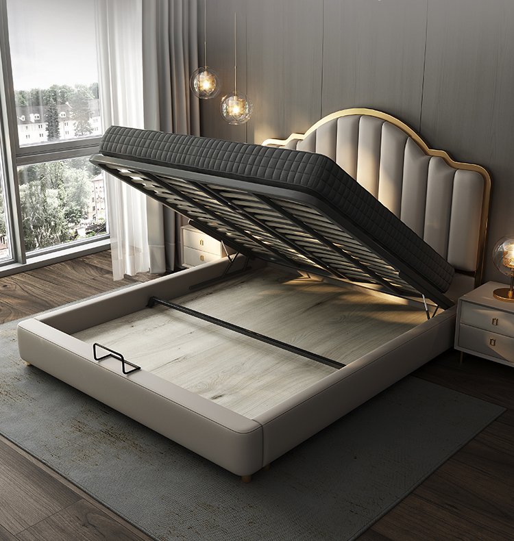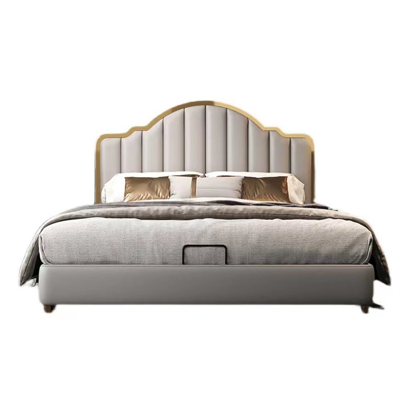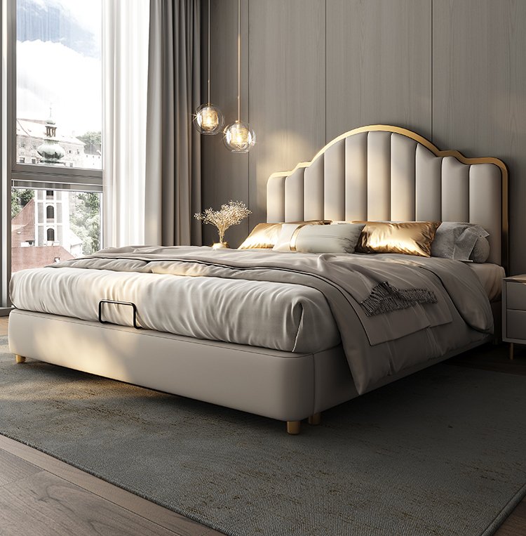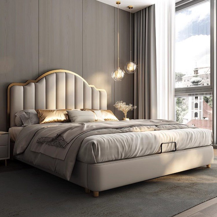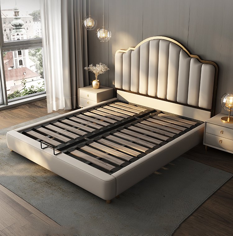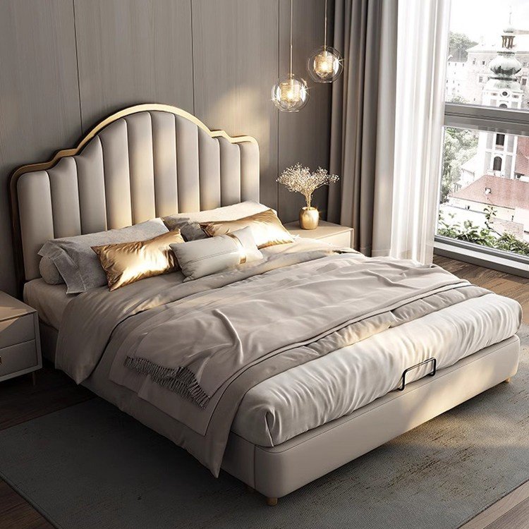 Its gracefully curved silhouette adds a soft, artistic touch, creating a statement of refined elegance that enhances any bedroom interior. The bed is elevated with titanium-plated accents, offering a sleek, modern finish that is resistant to corrosion, fading, and everyday wear, ensuring lasting beauty over time.