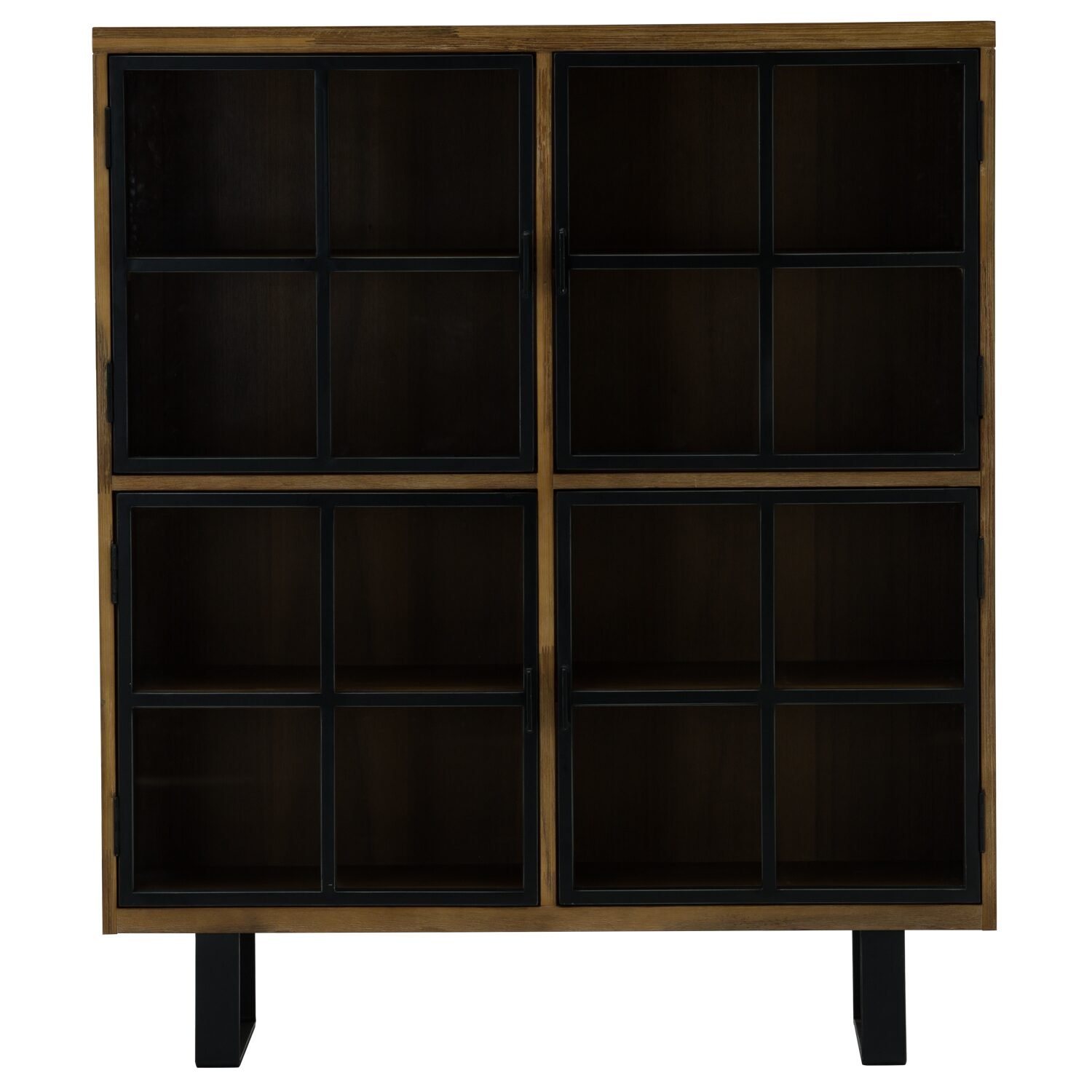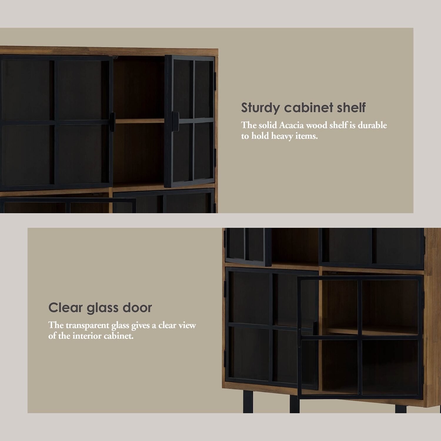 The metal frame adds an element of interest to the cabinet door, Sturdy cabinet shelf The solid Acacia wood shelf is durable to hold heavy items, Clear glass door The transparent glass gives a clear view of the interior cabinet, Space organizer Featuring four cabinets reasonably divided by a shelf providing a functional storage, Stable legs The U-shape legs provide an excellent support to the overall structure