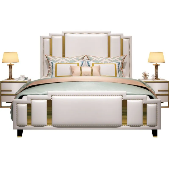 To complete the design, the statement headboard showcases a modern geometric pattern highlighted with gold accents—instantly becoming the focal point of the room.