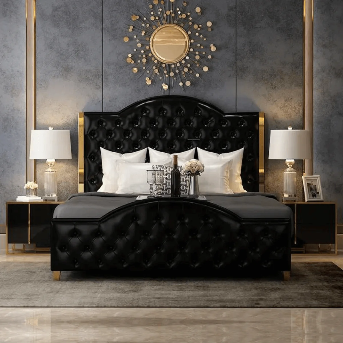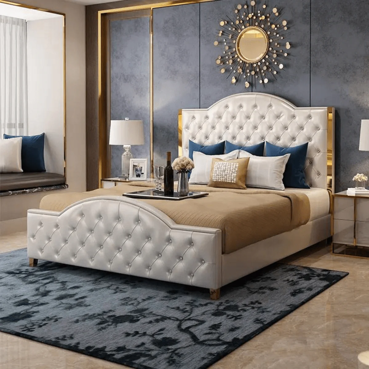 Its gracefully curved silhouette adds a soft, artistic touch, creating a statement of refined elegance that enhances any bedroom interior. The bed is elevated with titanium-plated accents, offering a sleek, modern finish that is resistant to corrosion, fading, and everyday wear, ensuring lasting beauty over time.