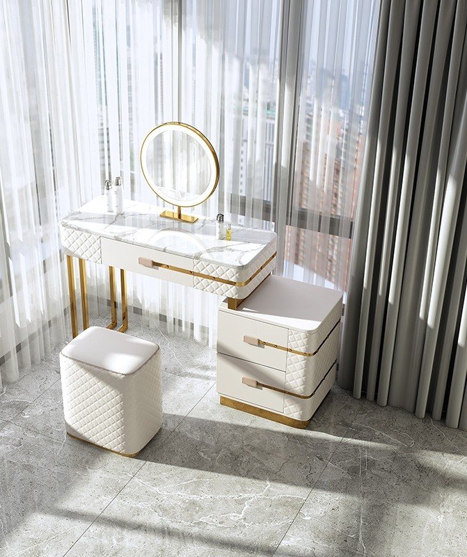 Designed with practicality in mind, the vanity includes a spacious four storage drawers to keep your essentials organized and clutter-free. Completing the set is a comfortable padded stool that slides neatly underneath, along with a modern LED mirror featuring three lighting modes—perfect for precise makeup application and glowing selfies.