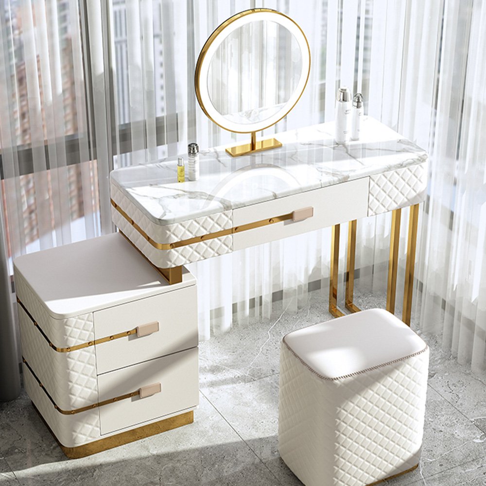 Elevate your bedroom with the luxurious La Parisienne 3 Piece Vanity Set, crafted for those who value refined beauty and everyday functionality. This stunning piece blends a white marble tabletop, covered in microfiber leather, and gold stainless-steel accents to create a vanity that feels both modern and timeless.