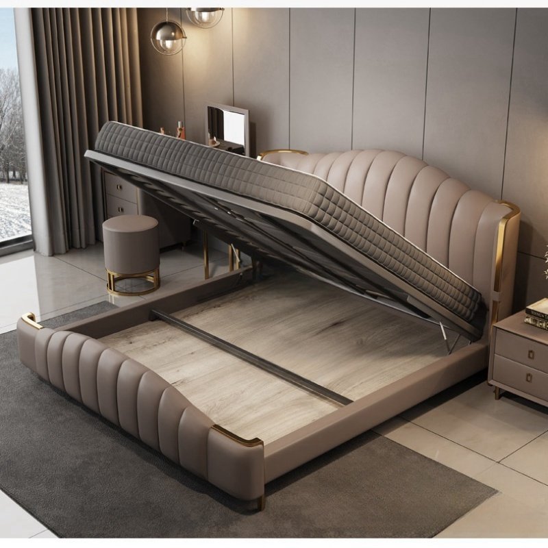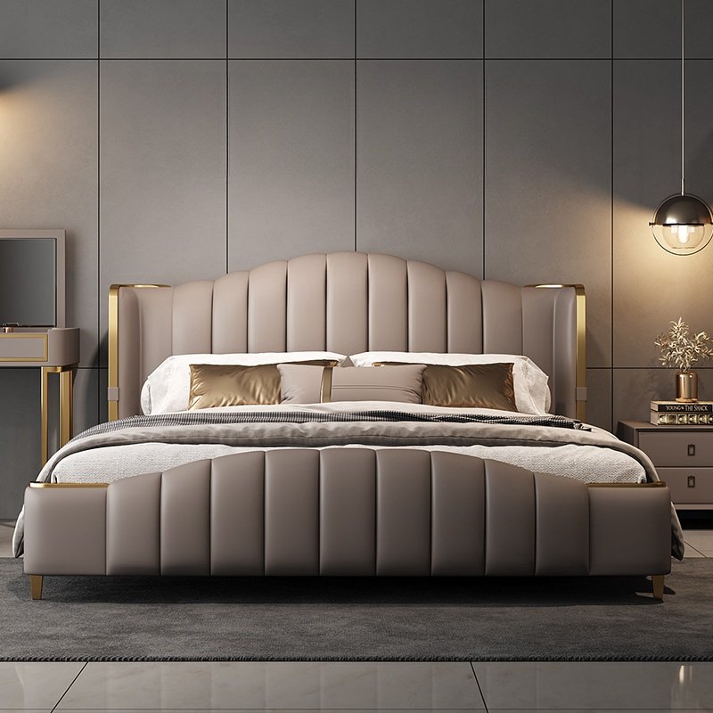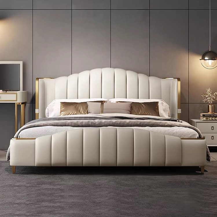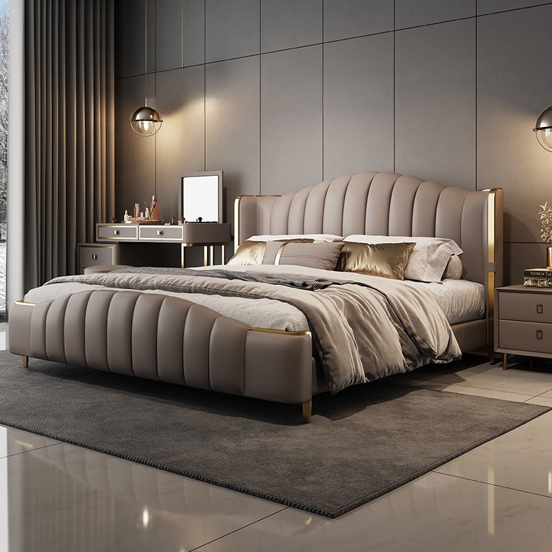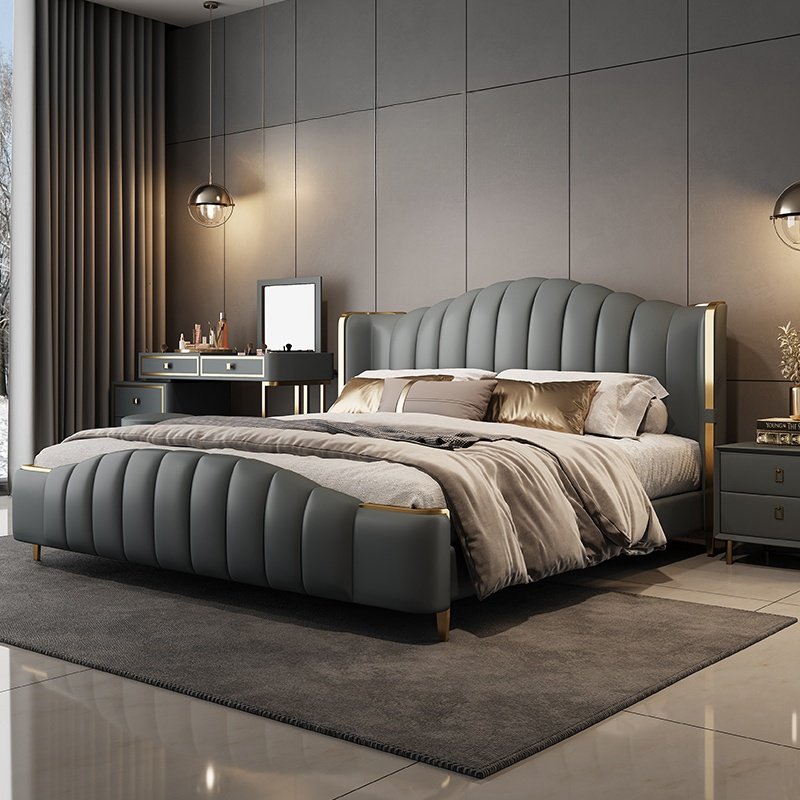 Its gracefully curved silhouette adds a soft, artistic touch, creating a statement of refined elegance that enhances any bedroom interior. The bed is elevated with titanium-plated accents, offering a sleek, modern finish that is resistant to corrosion, fading, and everyday wear, ensuring lasting beauty over time.