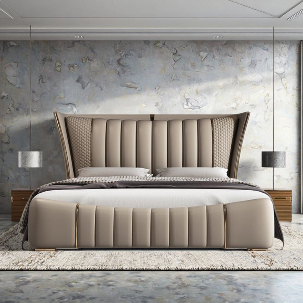 Its gracefully curved silhouette adds a soft, artistic touch, creating a statement of refined elegance that enhances any bedroom interior. The bed is elevated with titanium-plated accents, offering a sleek, modern finish that is resistant to corrosion, fading, and everyday wear, ensuring lasting beauty over time.