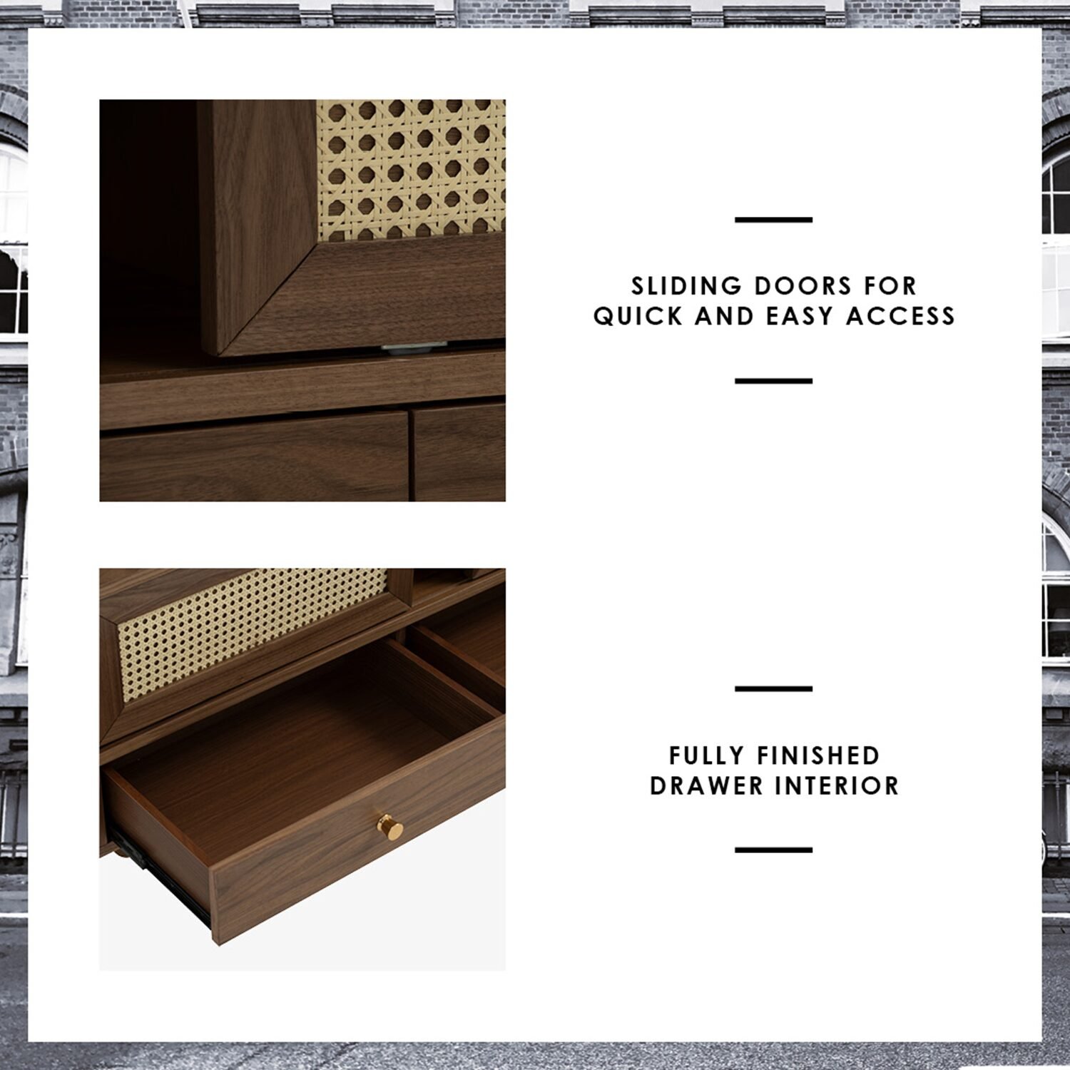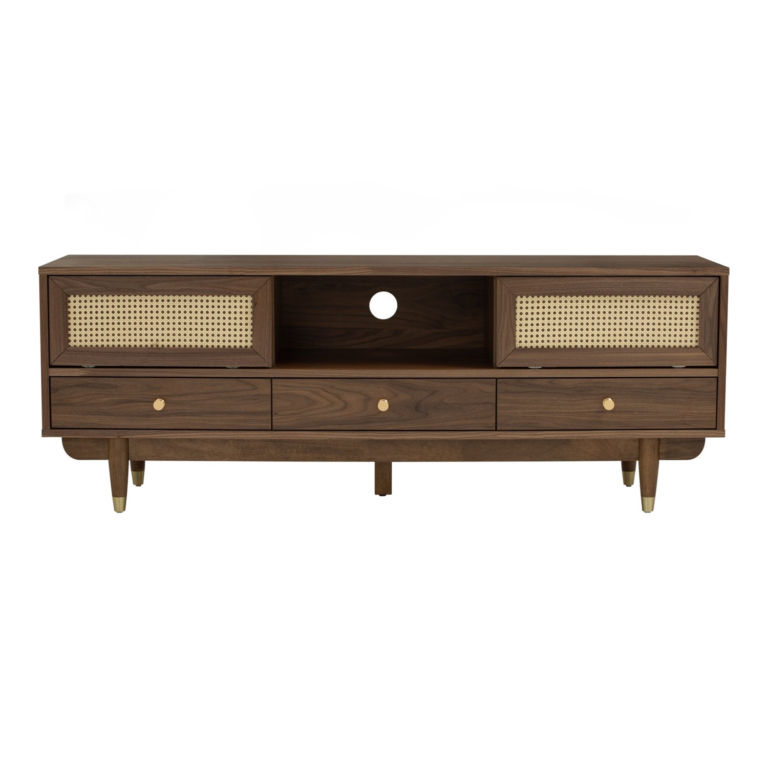 Product Key Features: Natural wood veneer, timelessly beautiful, woven synthetic Rattan on door, solid Malaysian oak legs with gold metal caps, round cut holes for cable management, sliding doors for quick and easy access, fully finished drawer interior