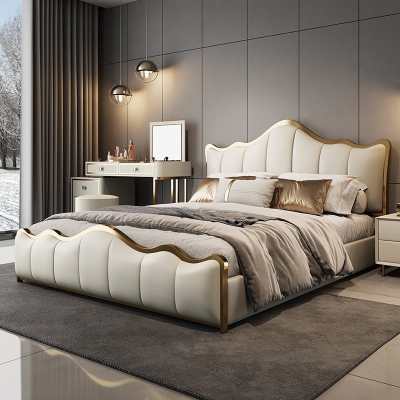 The elegantly curved silhouette showcases artistic craftsmanship, creating a sophisticated focal point in any bedroom. Accented with gold metal-plated detailing, the Frances Bedframe exudes modern luxury while offering resistance to wear, corrosion, and fading—ensuring its beauty lasts for years to come.