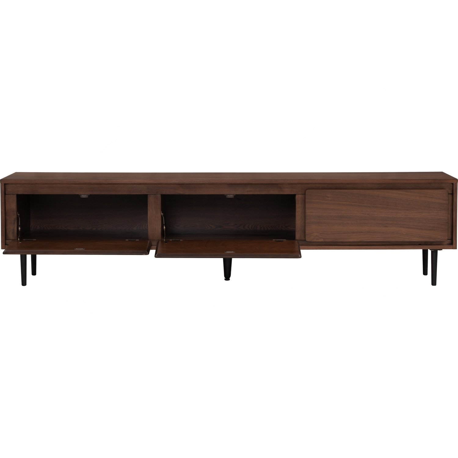 Hutto 1.8M TV Cabinet in Walnut veneer body with Matt Black Epoxy leg, a perfect addition to elevate your home entertainment experience. Its generous 1.8-meter length accommodates large screens and offers ample storage space. The rich walnut color adds warmth and style to your living area, making Hutto 1.8M TV Cabinet TV Cabinet a functional and aesthetically pleasing choice for your entertainment needs.