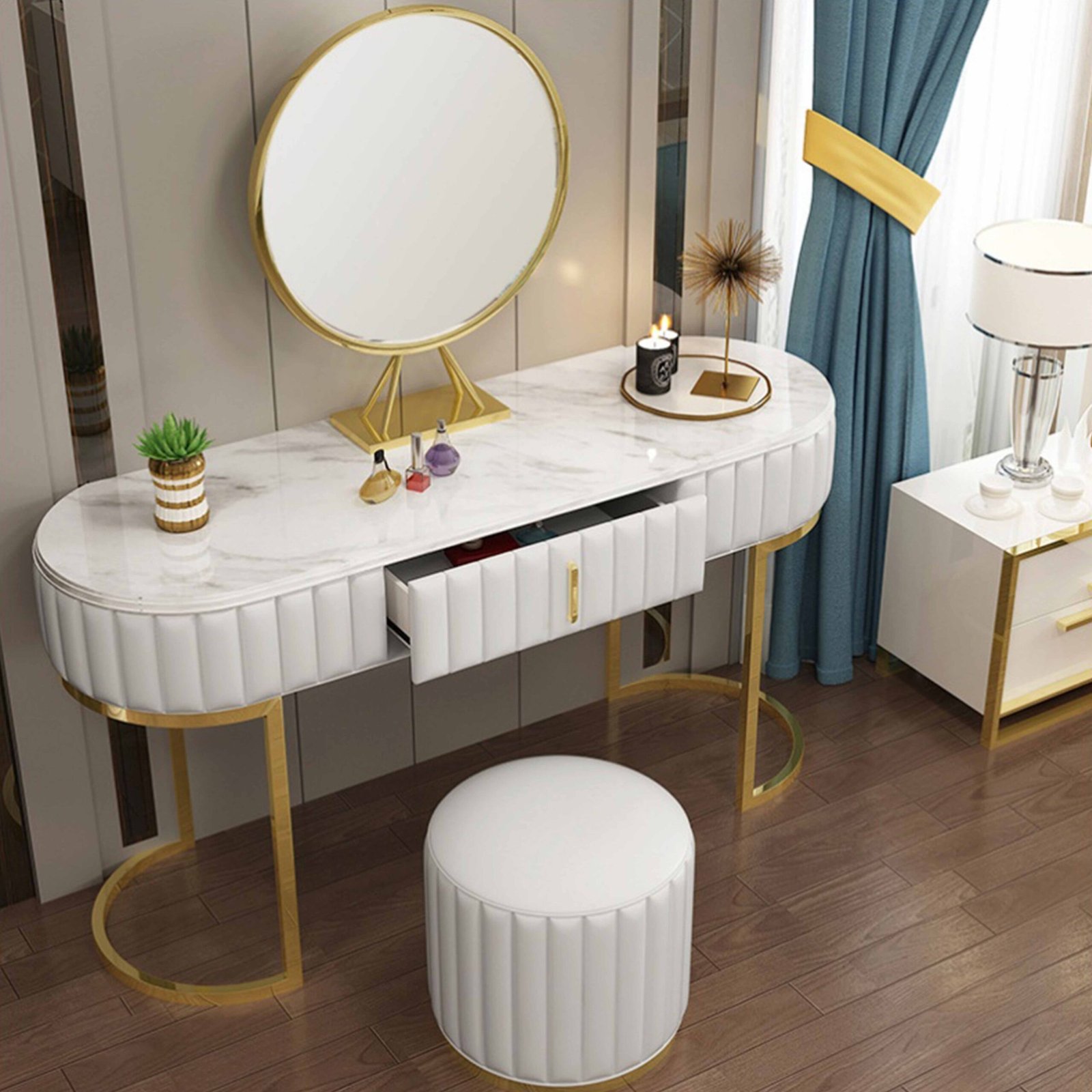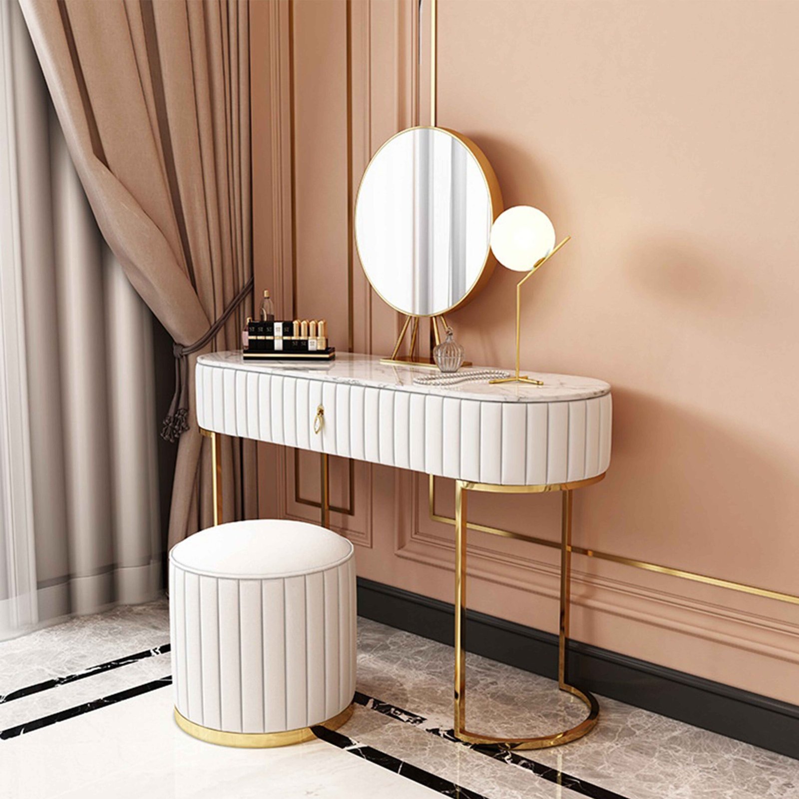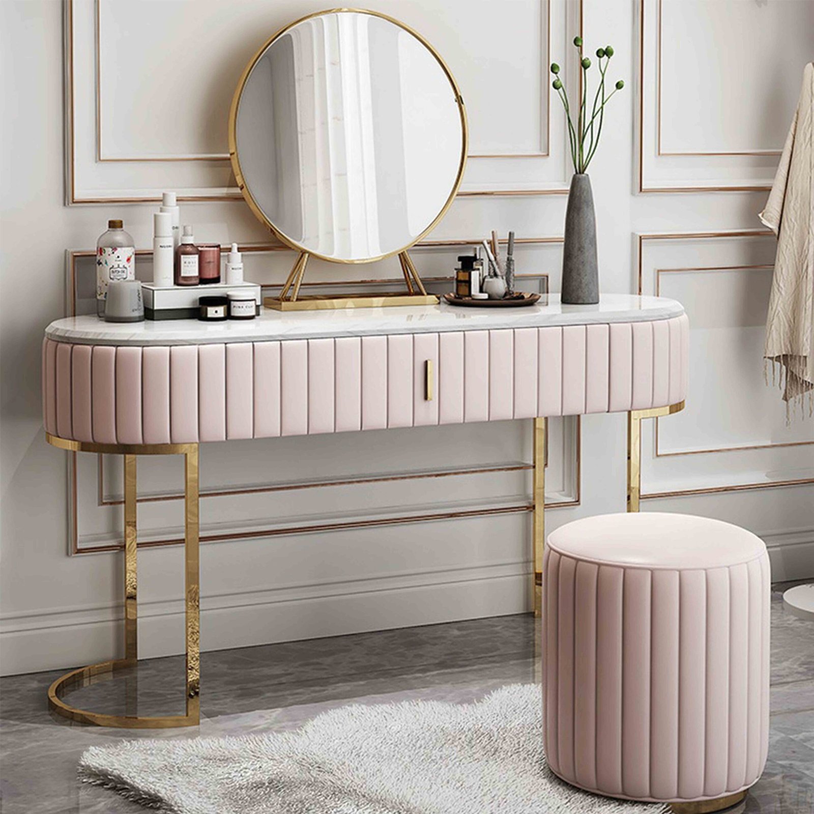 Elevate your bedroom with the luxurious Versailles Vanity Set, crafted for those who value refined beauty and everyday functionality. This stunning piece blends a marble tabletop, covered in premium leather, and gold stainless-steel accents to create a vanity that feels both modern and timeless.