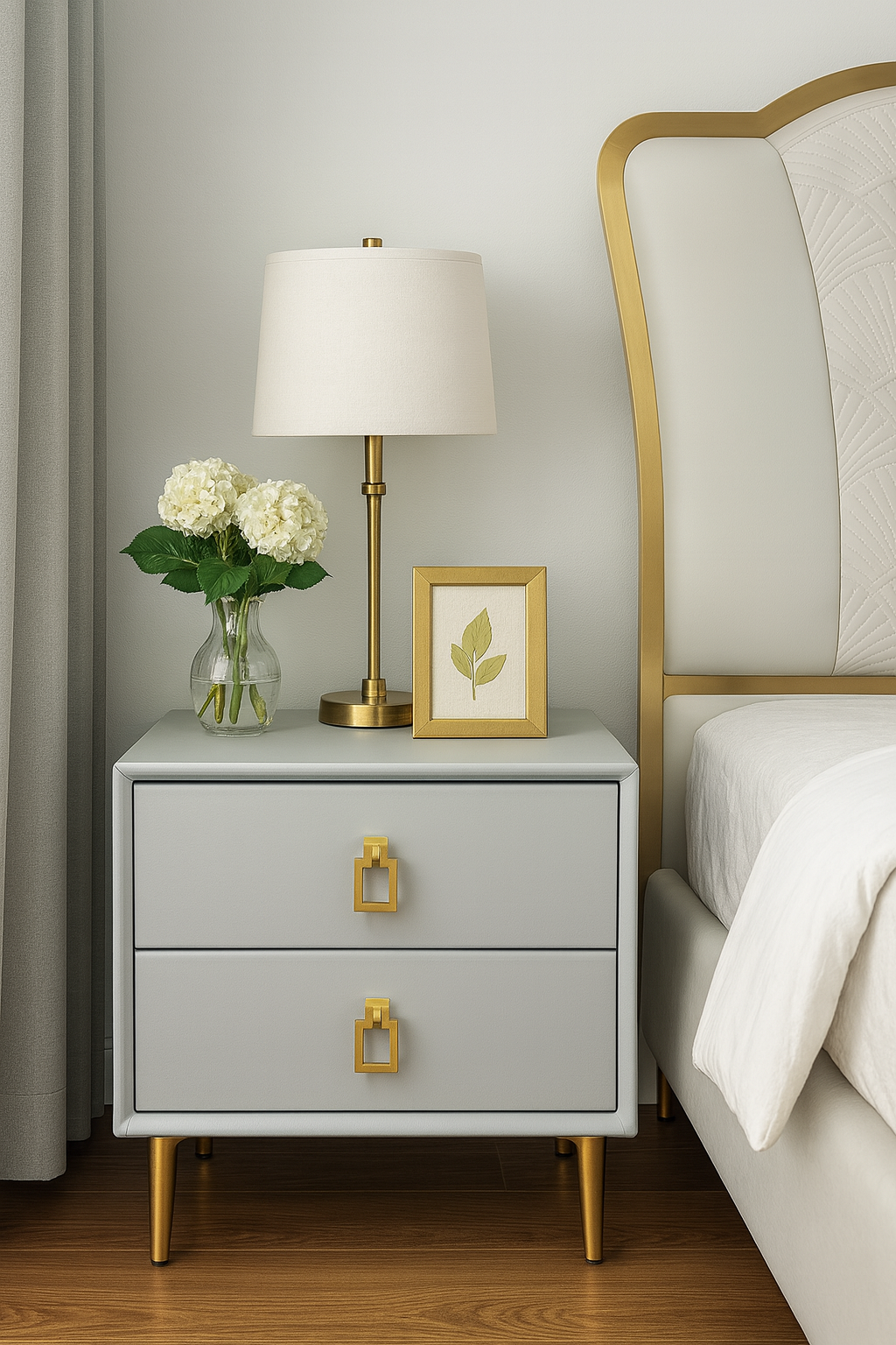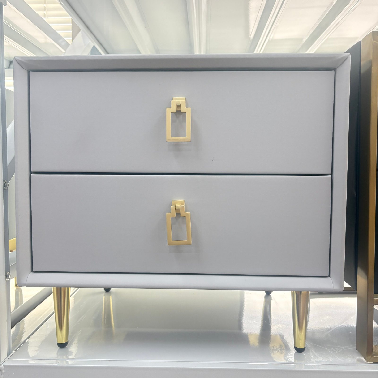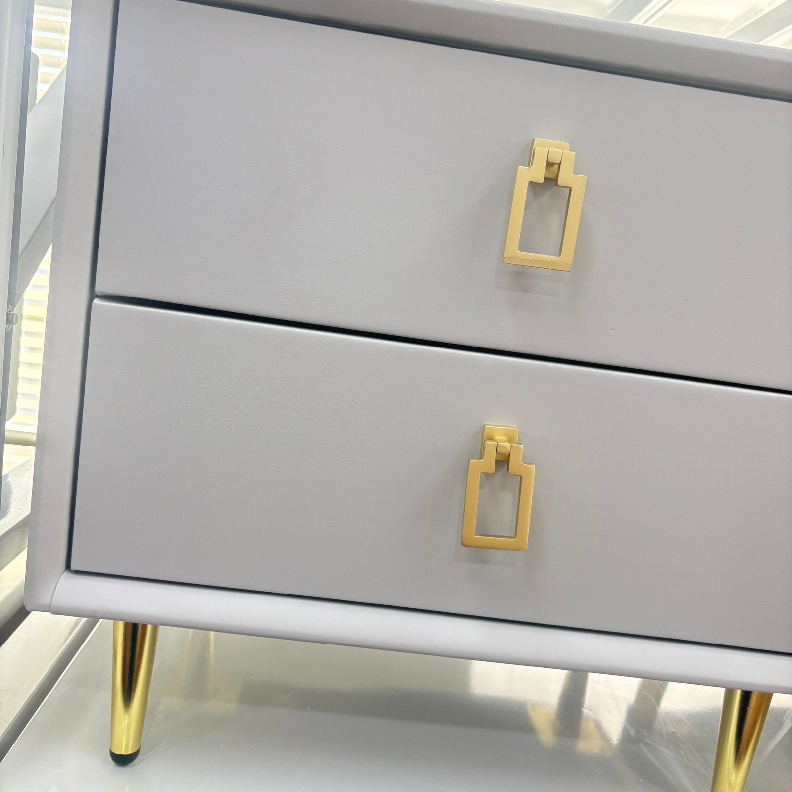 Elevate your bedroom with the Sophisticated Two-Drawer Nightstand. This stylish piece features a premium grey finish with gold-toned metal accents, creating a modern and luxurious look. The nightstand’s two spacious drawers provide ample storage for your bedside essentials.