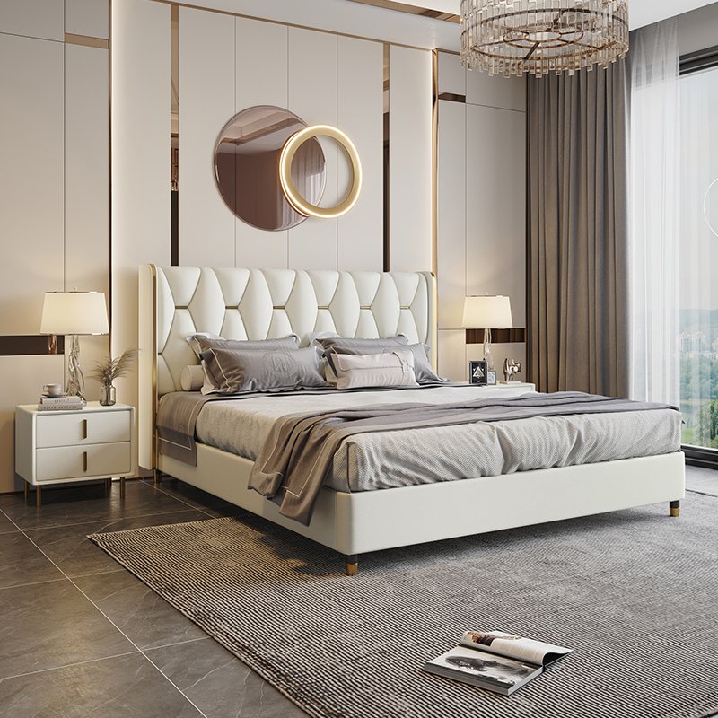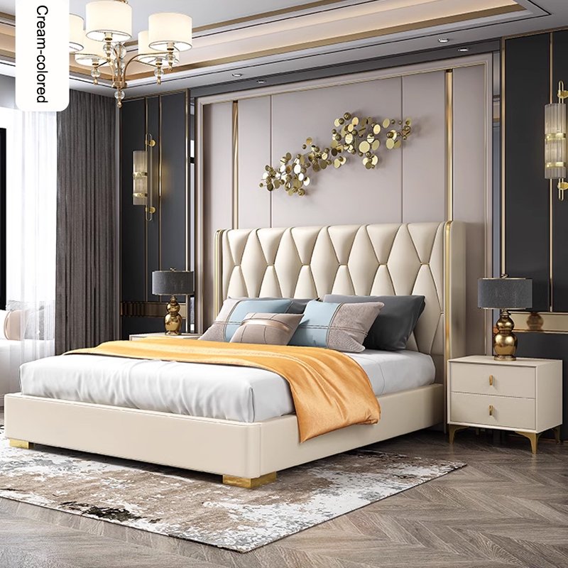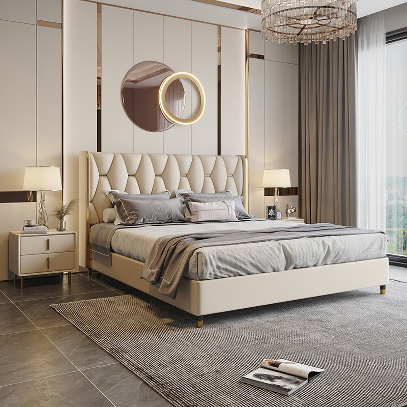 Its gracefully curved silhouette adds a soft, artistic touch, creating a statement of refined elegance that enhances any bedroom interior. The bed is elevated with titanium-plated accents, offering a sleek, modern finish that is resistant to corrosion, fading, and everyday wear, ensuring lasting beauty over time.