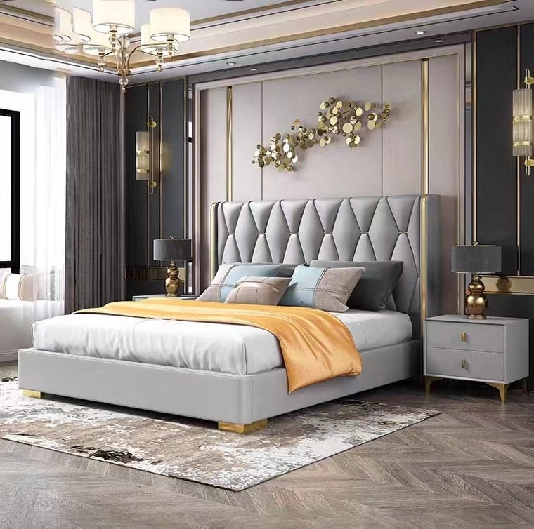 Its gracefully curved silhouette adds a soft, artistic touch, creating a statement of refined elegance that enhances any bedroom interior. The bed is elevated with titanium-plated accents, offering a sleek, modern finish that is resistant to corrosion, fading, and everyday wear, ensuring lasting beauty over time.