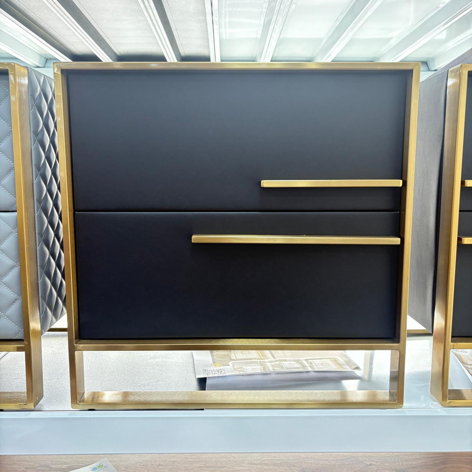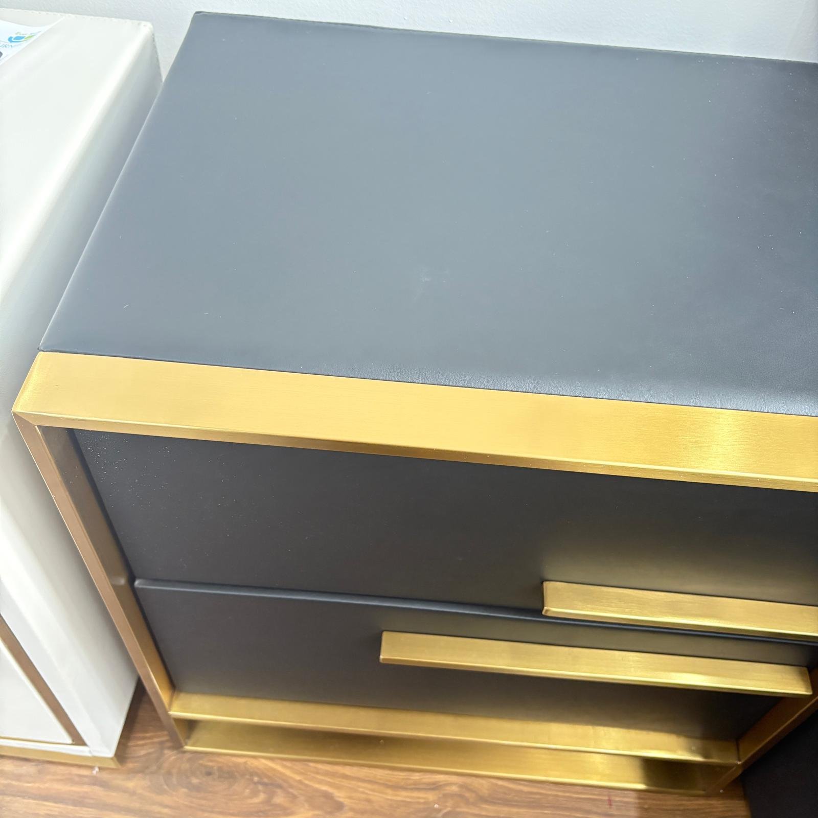 Elevate your bedroom with the Sophisticated Two-Drawer Nightstand. This stylish piece features a sleek Black Microfiber Leather finish with gold-toned metal accents, creating a modern and luxurious look. The nightstand’s two spacious drawers provide ample storage for your bedside essentials.