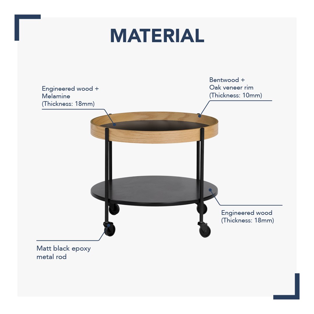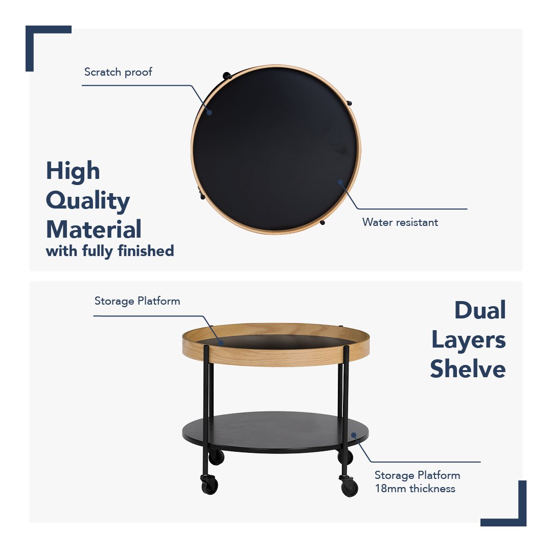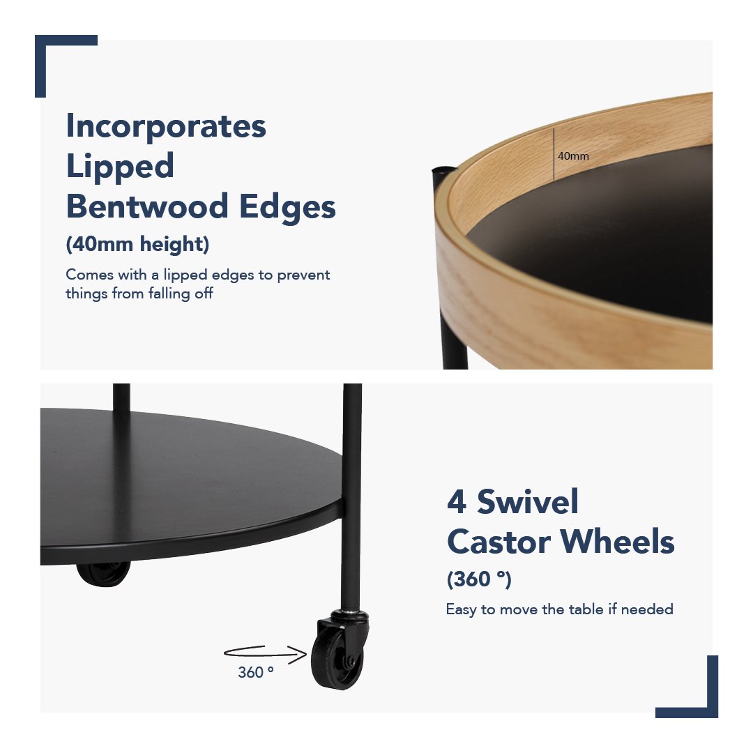 Product Key Features: High Quality Material with fully finished , Scratch proof, Water resistant, Comes with a lipped edges to prevent things from falling off, 4 Swivel Wheels (360 º). Easy to move the table if needed, Easy to Assemble.