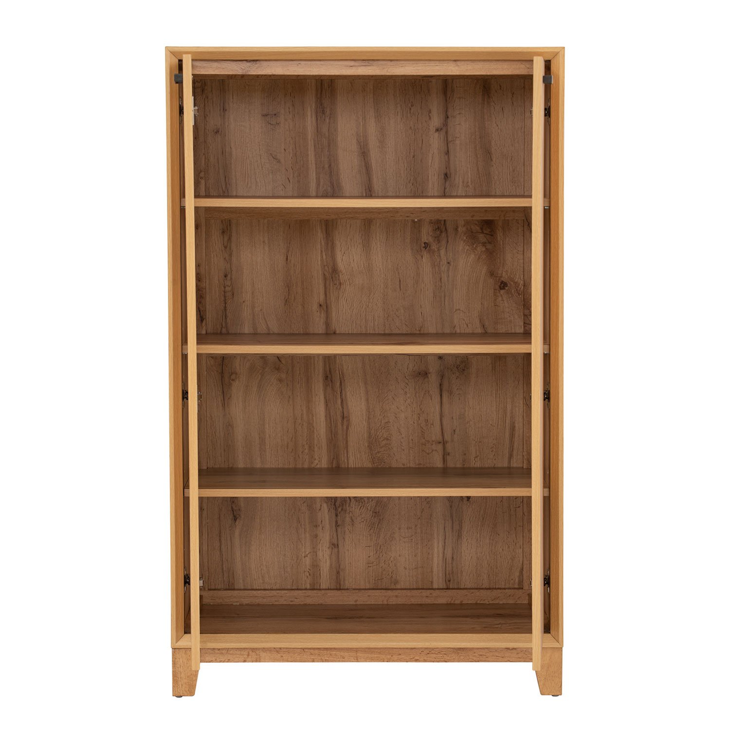 Crafted from sturdy MDF and laminated board, it boasts solid rubberwood legs for stability. Its natural oak finish adds warmth to any room, while two open hinge doors reveal five spacious tiers inside. Whether used for storage, organizations, or display, this cabinet offers endless possibilities.