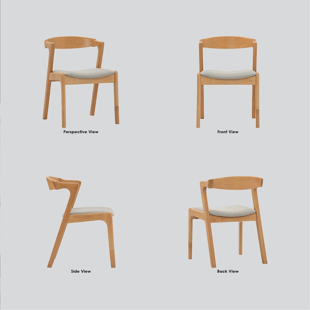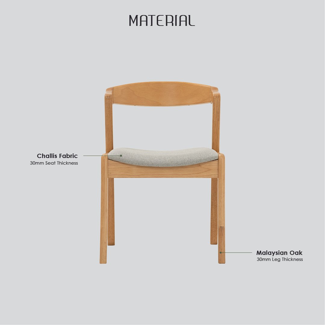 Nazo dining chair in Natural colour frame, Light Grey colour Challis fabric cushion seat. The Nazo Dining Chair highlights Mid-Century Modern styling with a Contemporary edge, designed for versatility and everyday use. Built with a Malaysian oak frame in a Natural finish, the chair showcases organic warmth and durability. Upholstered in Challis fabric in Light Grey, the seat provides comfort and an understated tone that suits various interiors. With its simple yet elegant profile, the Nazo Dining Chair adapts well to both home dining rooms and hospitality environments. It offers a refined balance of style, practicality, and long-lasting quality.