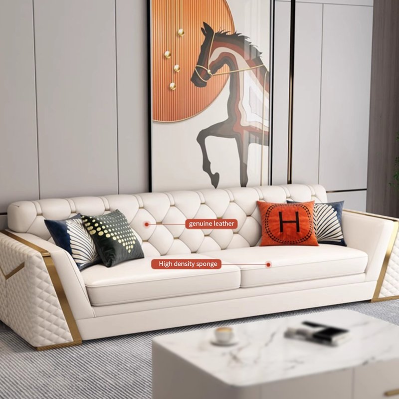 Beneath its elegant exterior, strength and stability are ensured by a solid wood internal frame, reinforced with serpentine spring suspension for superior resilience and shape retention. Finished with gold-plated stainless-steel feet, the sofa offers both visual brilliance and long-term corrosion resistance.
