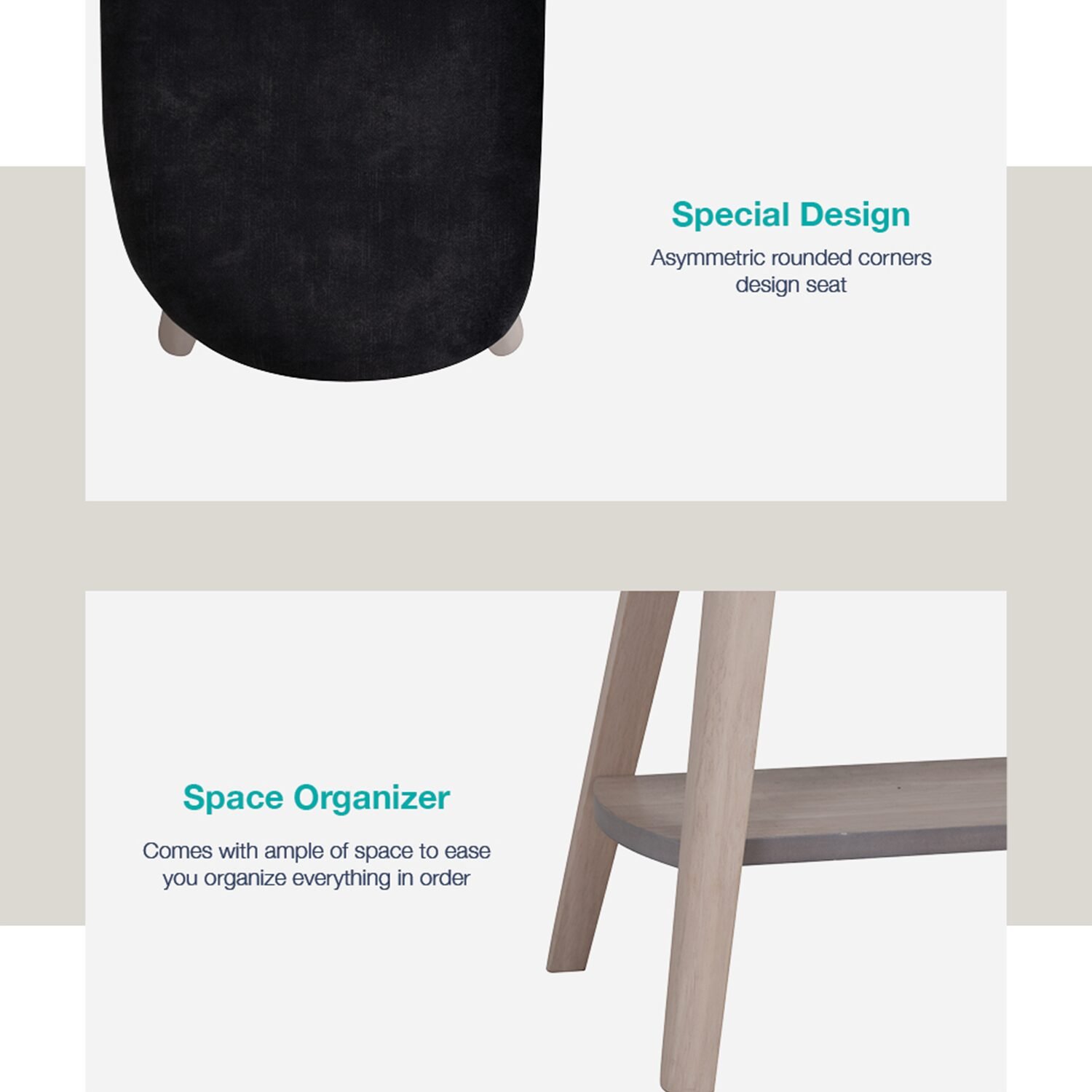 Product Key Features: Special Design Asymmetric rounded corners design seat , Space Organizer Comes with ample of space to ease you organize everything in order, Comfortable Seating Upholstered with Moleen fabric and high density foam for extra comfort, Strong Wood Frame Sturdy with wide wooden frame support