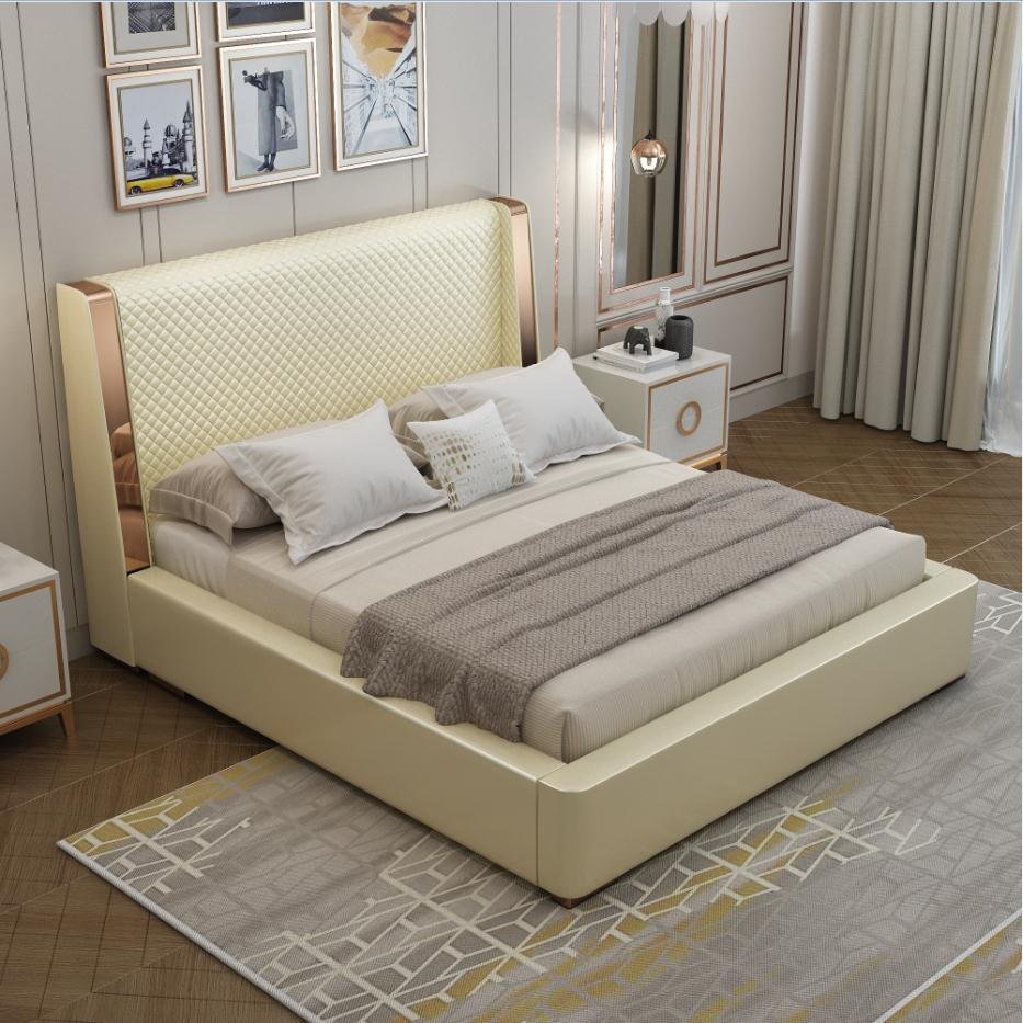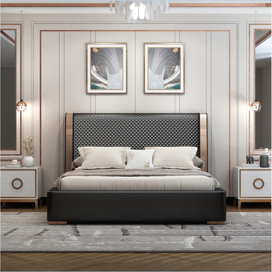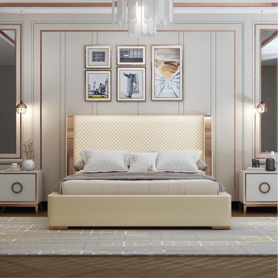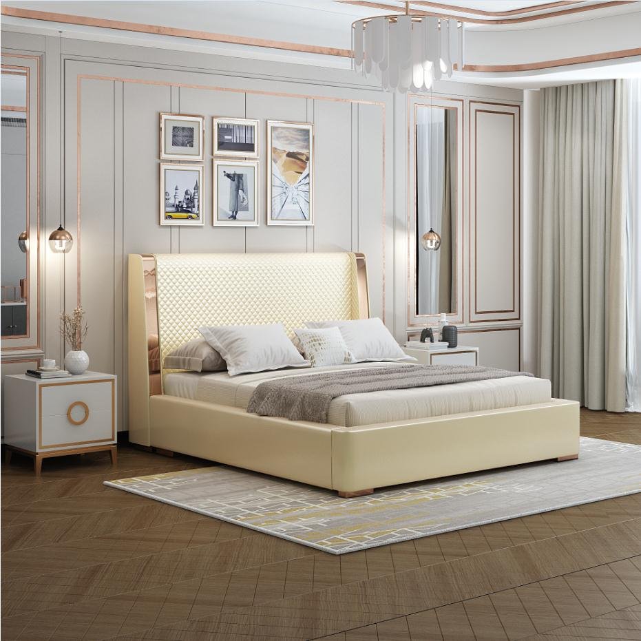 Its gracefully curved silhouette adds a soft, artistic touch, creating a statement of refined elegance that enhances any bedroom interior. The bed is elevated with titanium-plated accents, offering a sleek, modern finish that is resistant to corrosion, fading, and everyday wear, ensuring lasting beauty over time.