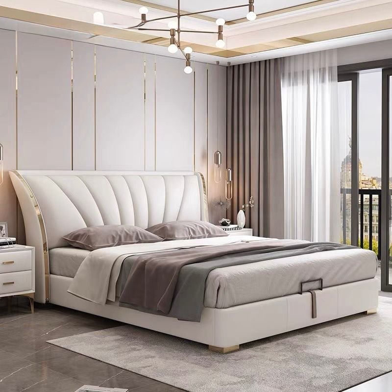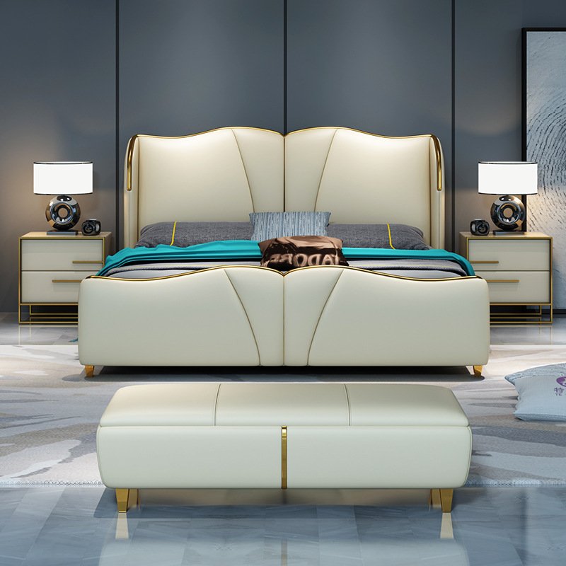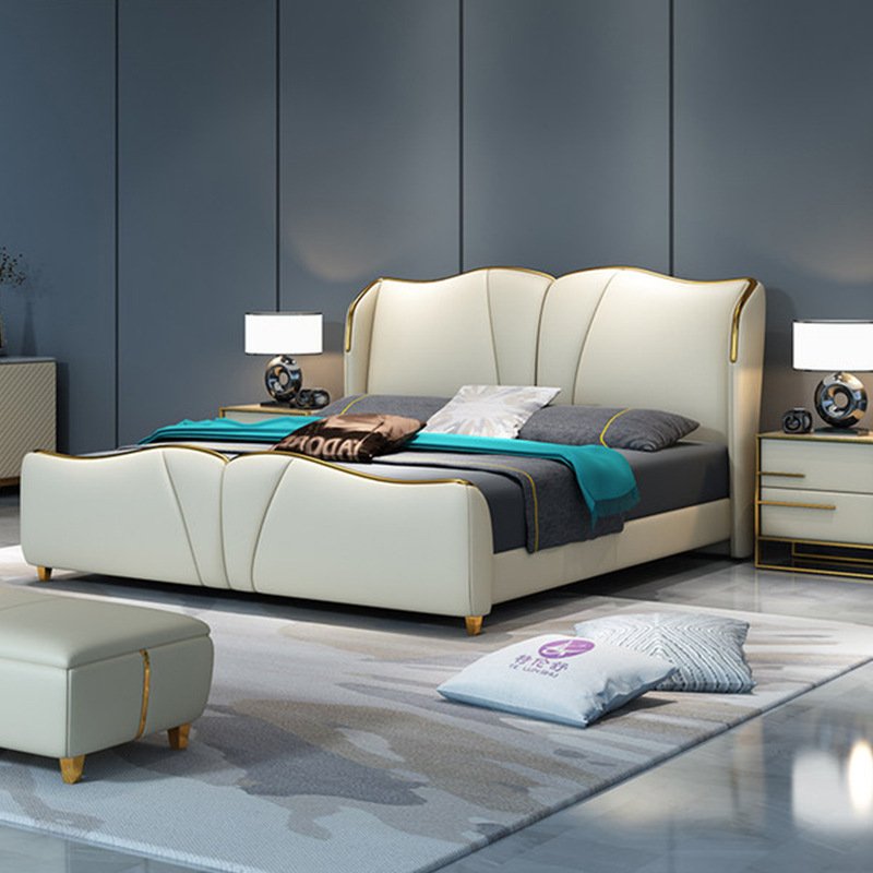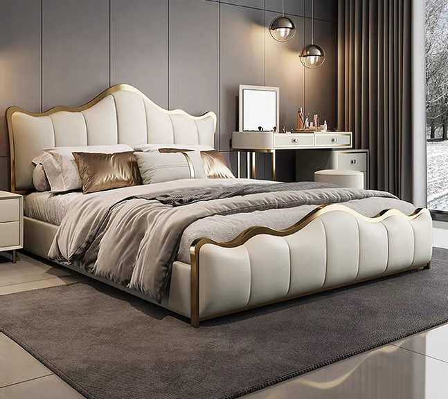 Its gracefully curved silhouette adds a soft, artistic touch, creating a statement of refined elegance that enhances any bedroom interior. The bed is elevated with titanium-plated accents, offering a sleek, modern finish that is resistant to corrosion, fading, and everyday wear, ensuring lasting beauty over time.