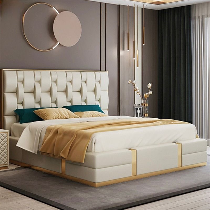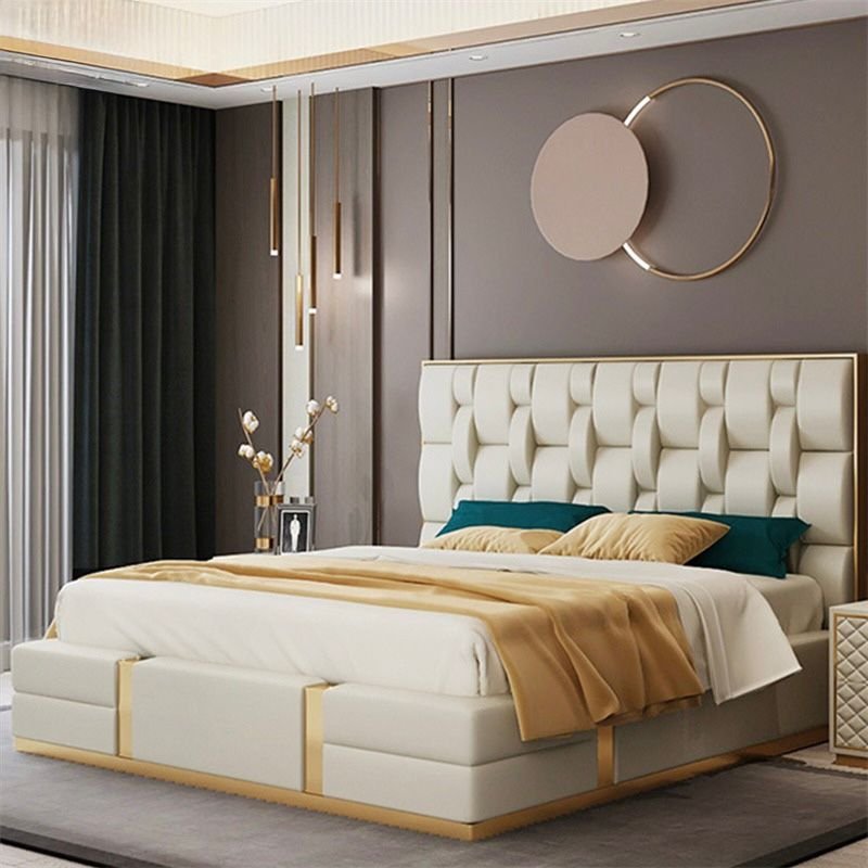 Its gracefully curved silhouette adds a soft, artistic touch, creating a statement of refined elegance that enhances any bedroom interior. The bed is elevated with titanium-plated accents, offering a sleek, modern finish that is resistant to corrosion, fading, and everyday wear, ensuring lasting beauty over time.
