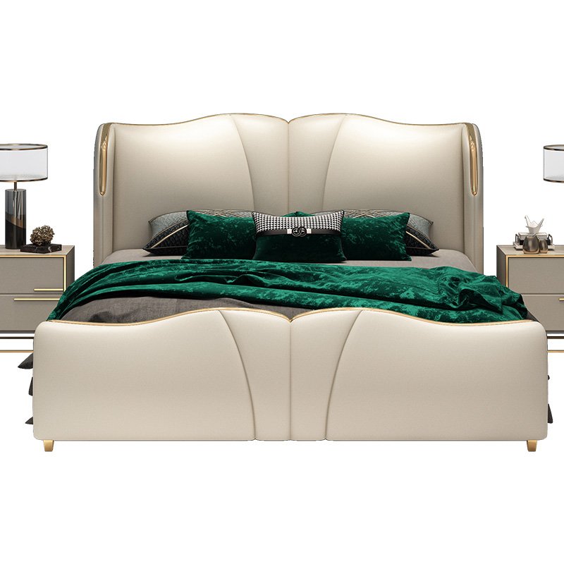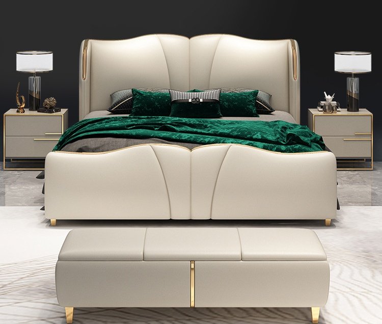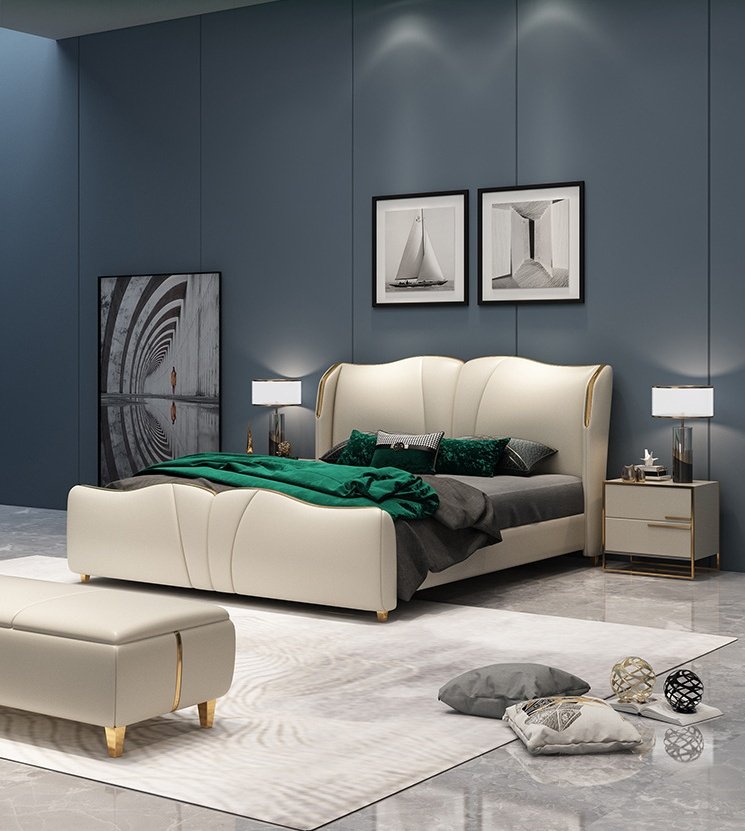 Its gracefully curved silhouette adds a soft, artistic touch, creating a statement of refined elegance that enhances any bedroom interior. The bed is elevated with titanium-plated accents, offering a sleek, modern finish that is resistant to corrosion, fading, and everyday wear, ensuring lasting beauty over time.